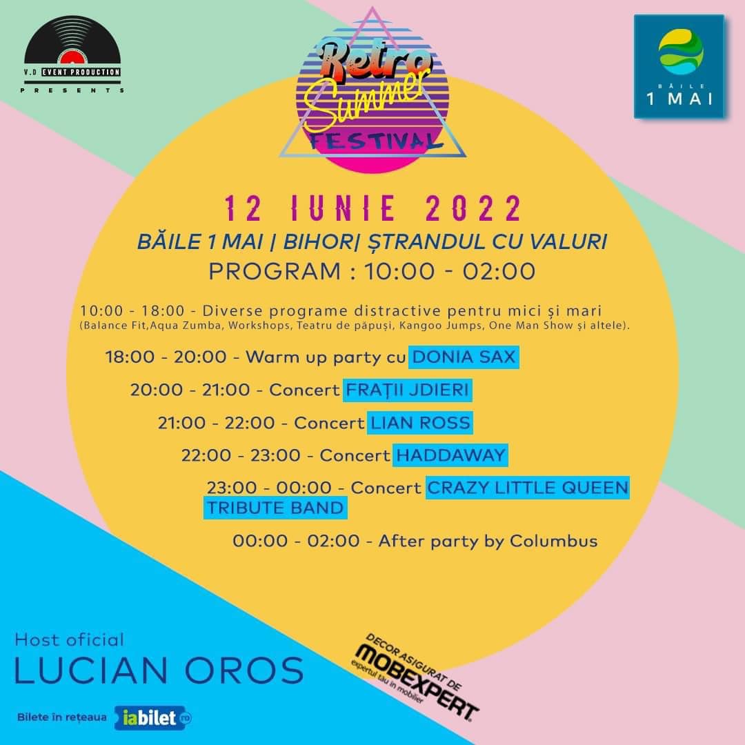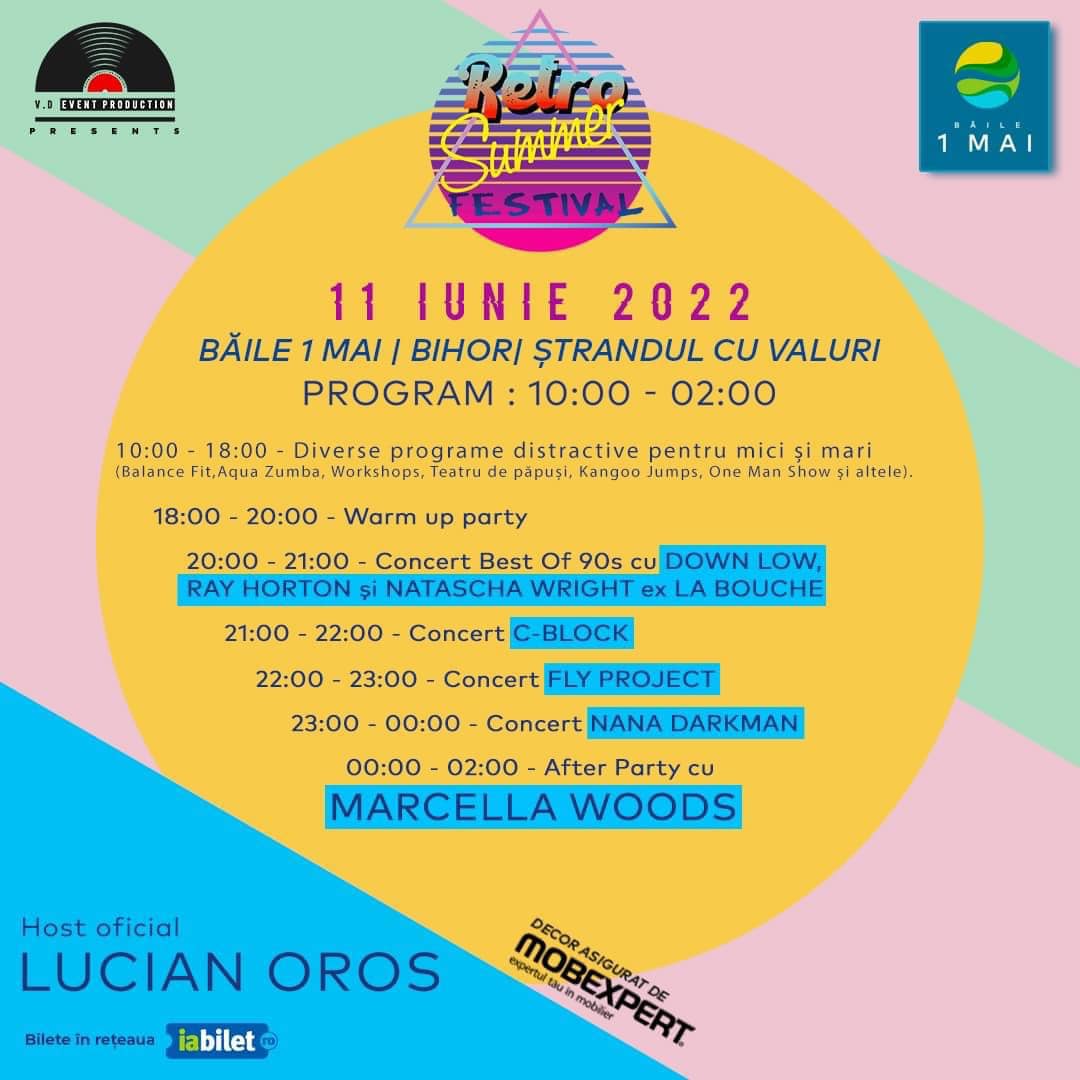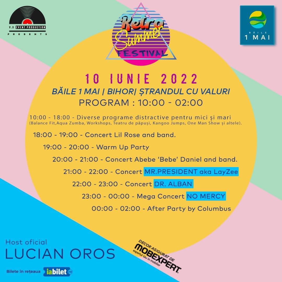 Pe parcursul zilei festivalierii se vor putea răcori la piscină, pentru ca seara să participe la concerte. În fiecare dintre cele trei zile, până la ora 18:00, vor avea loc activități distractive pentru copii, dar nu numai. Festivalul dedicat muzicii retro are invitați de seamă. Spectacolul muzical începe în forță cu Lil Rose and Band, pentru ca apoi pe scenă să urce, pe rând, Abebe „Bebe” Daniel and band, Mr. President aka LayZee, Dr. Alban și No Mercy. Prima zi de spectacole se va încheia cu un after party by Columbus.