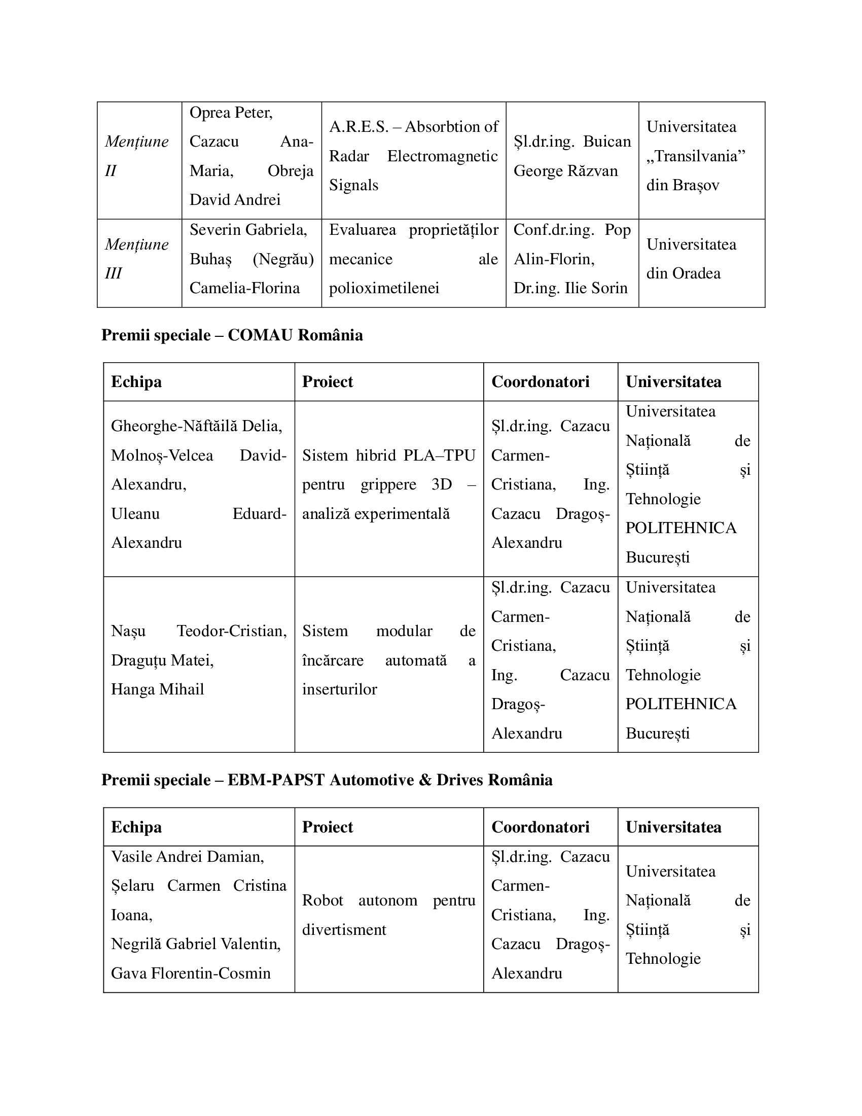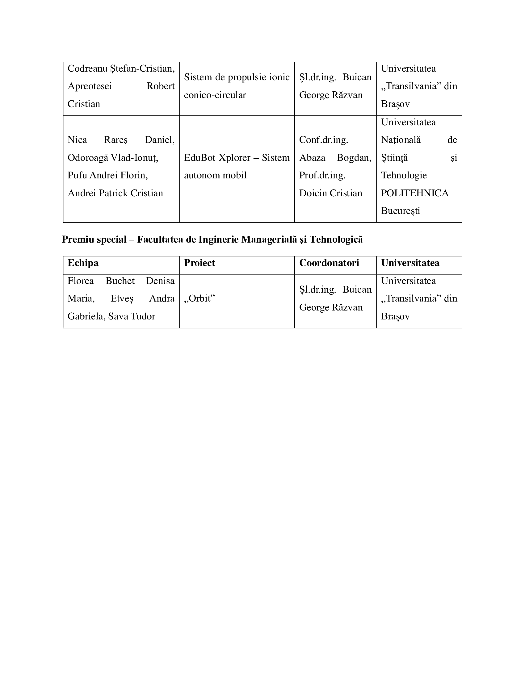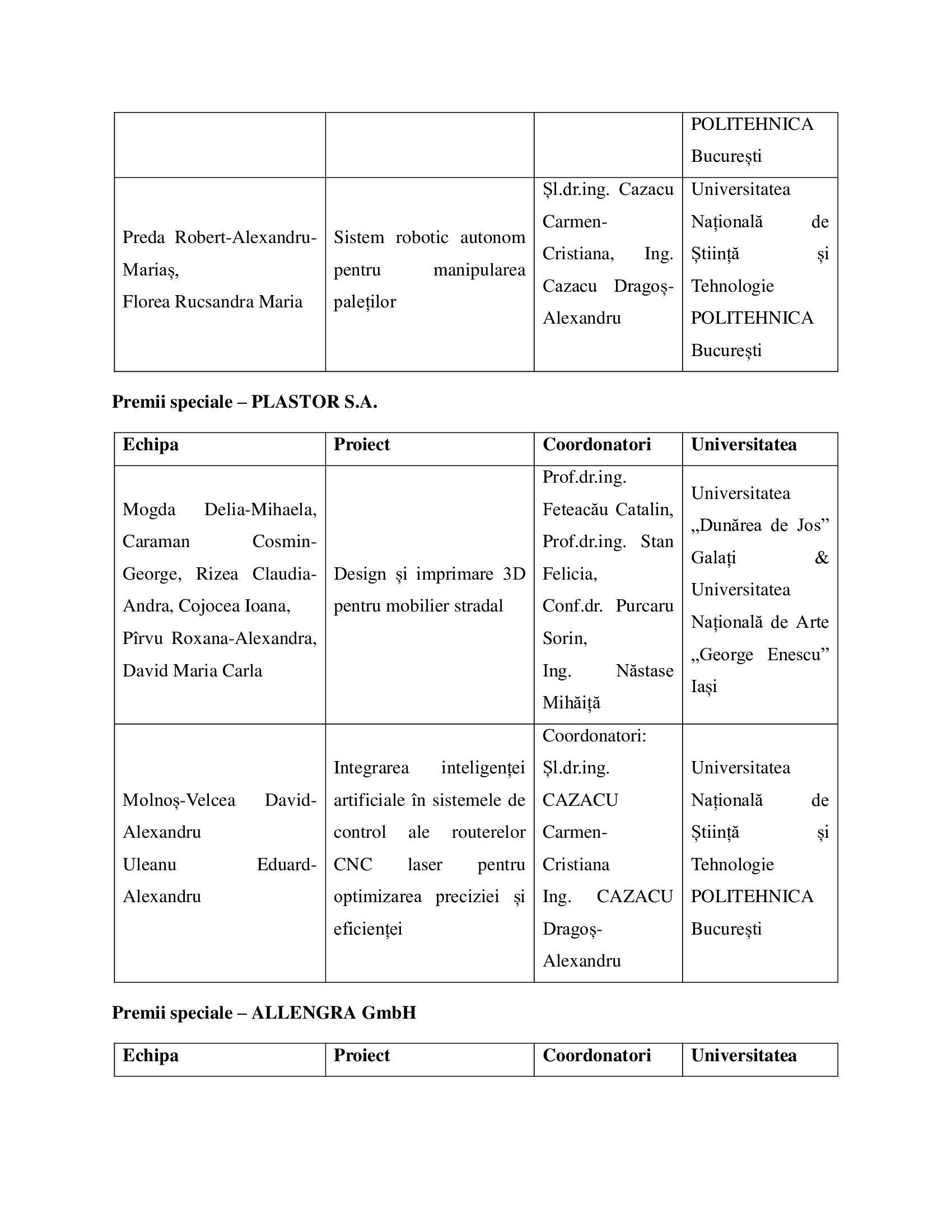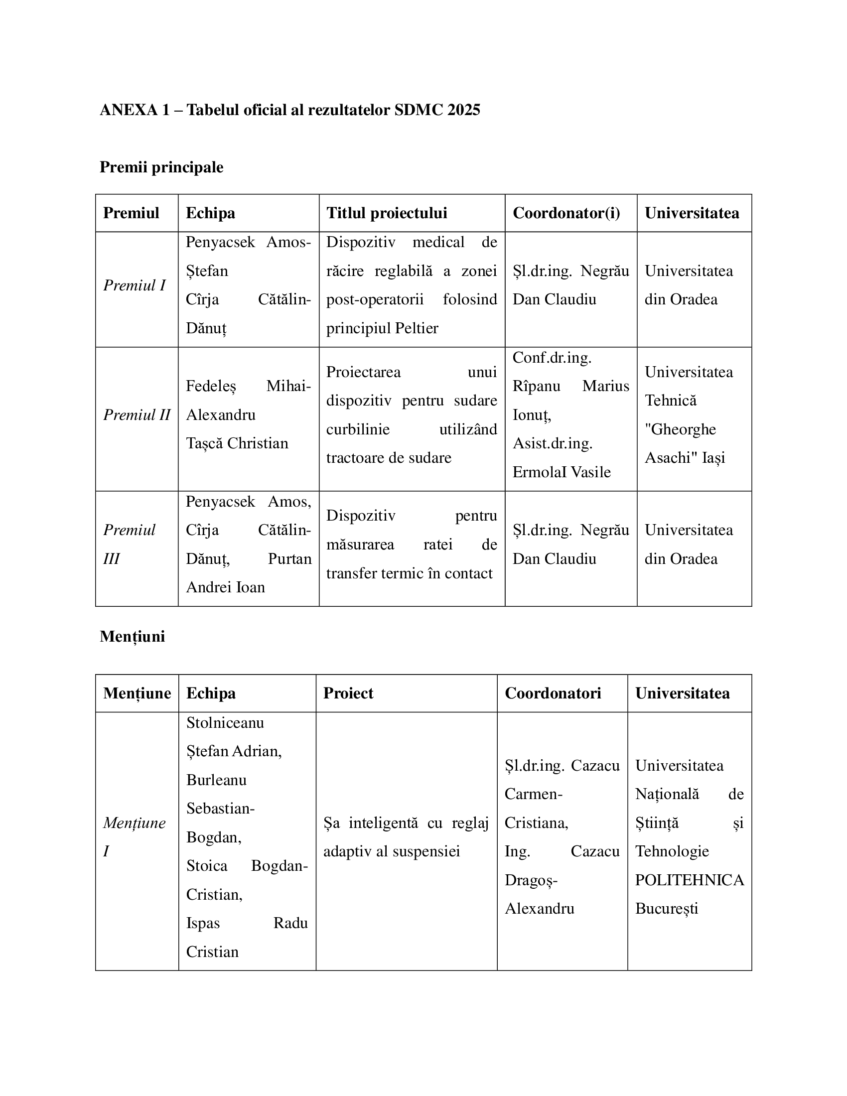 Premiile I, II și III, alături de mențiunile și premiile speciale, au fost acordate pentru proiecte remarcabile în domenii precum: dispozitive medicale, sisteme de sudare, structuri termo-mecanice, sisteme autonome, mobilier stradal inteligent, aplicații AI pentru controlul echipamentelor CNC, sisteme robotice modulare și altele. Lista completă a echipelor, proiectelor și coordonatorilor se regăsește Tabelul oficial al rezultatelor.