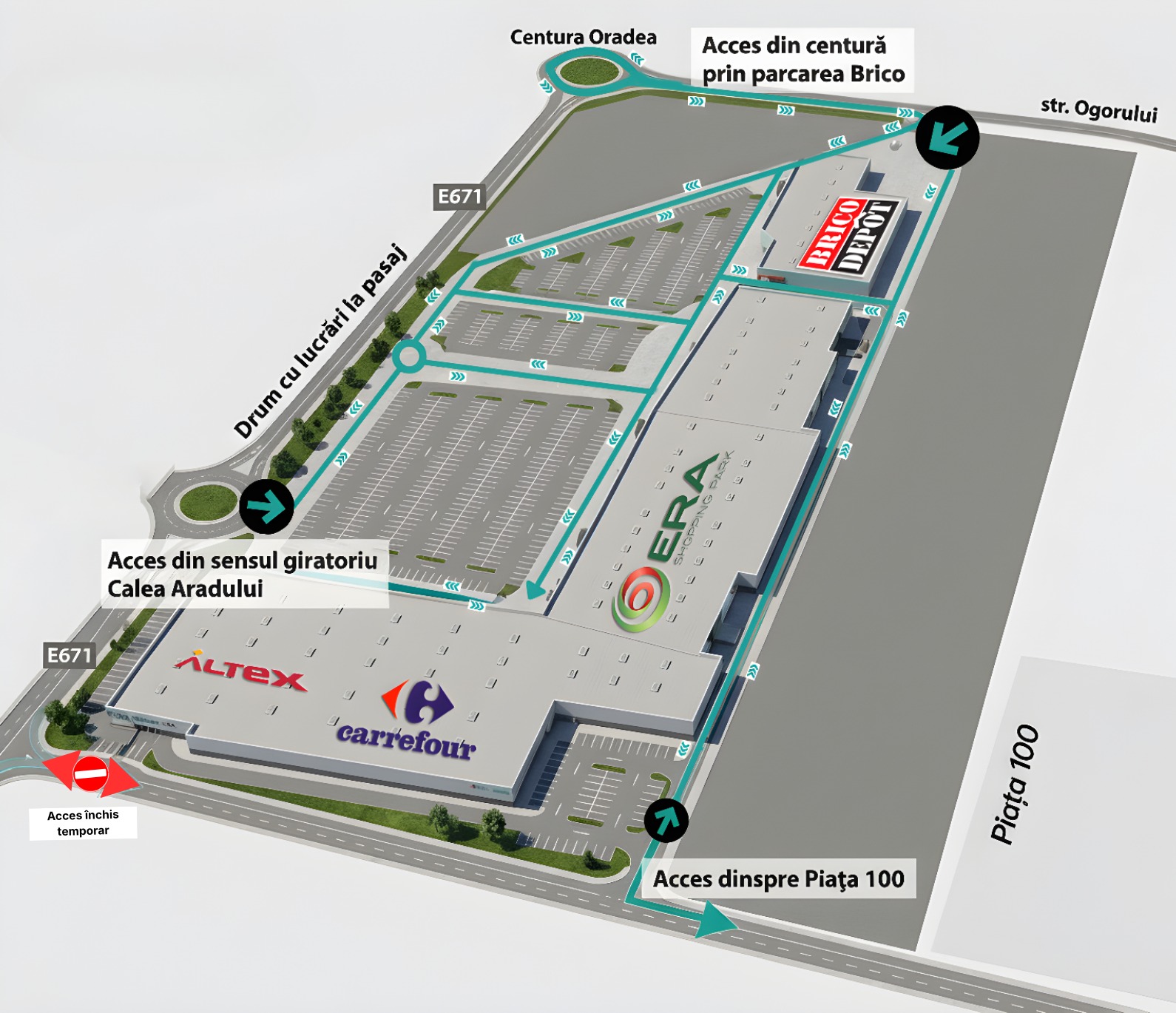Intrarea directă in E671 (zona indicată cu semnul roșu pe hartă) este momentan indisponibilă din cauza lucrărilor, dar clientii Era Park Oradea pot ajunge pana la depozitele Altex si Jysk.