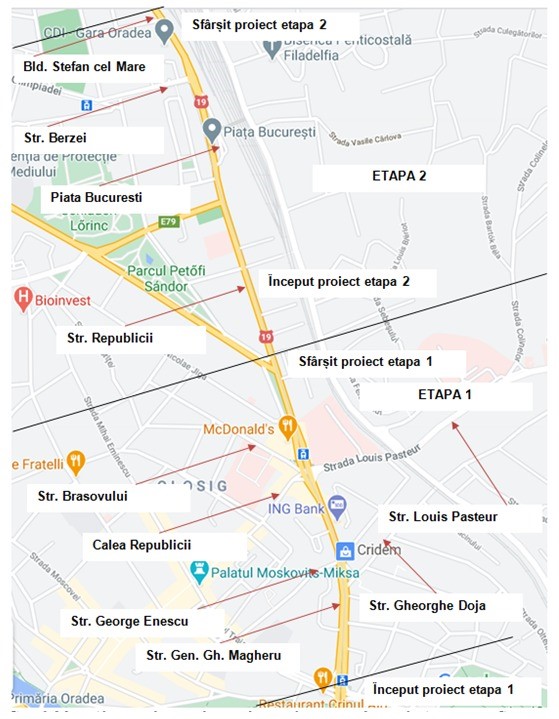 A doua etapă a proiectului vizează zona cuprinsă între Magazinul Crișul și Gara Oradea.