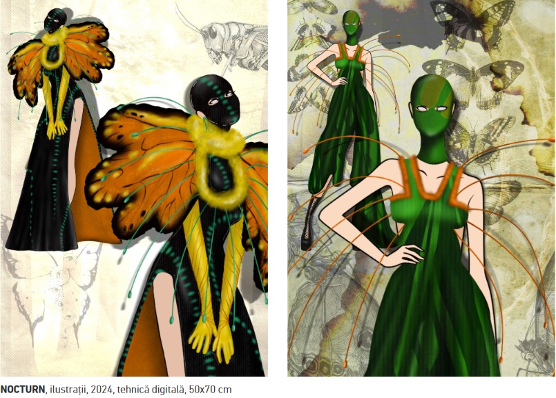 „Proiectul Nocturn se înrădăcinează tocmai în această căutare, în care, mânată de curiozitate, spirit ludic și atracție față de natură, se oprește asupra a ceea ce pentru ea reprezintă cel mai gingaș și grațios simbol din natură, fluturele. Ilustrațiile de modă pe care le creează sunt bazate pe contopirea a două specii de fluture, Ornithoptera croesus și Ornithoptera chimaera, pe selectarea unor componente specifice ale culorii, formei și modelului cromatic al acestora. Rezulatul este o colecție vestimentară de zece piese, însoțită de ilustrații individuale pentru fiecare ținută în parte, în care imaginile se îmbină armonios într-o compoziție plastică, decorativă. Gama cromatică este una vie, vibrantă, dar și echilibrată, astfel încât reușește să creeze o atmosferă misterioasă și să transmită un sentiment al contopirii cu natura”, punctează conf.univ.dr. Ștefan Gaie.