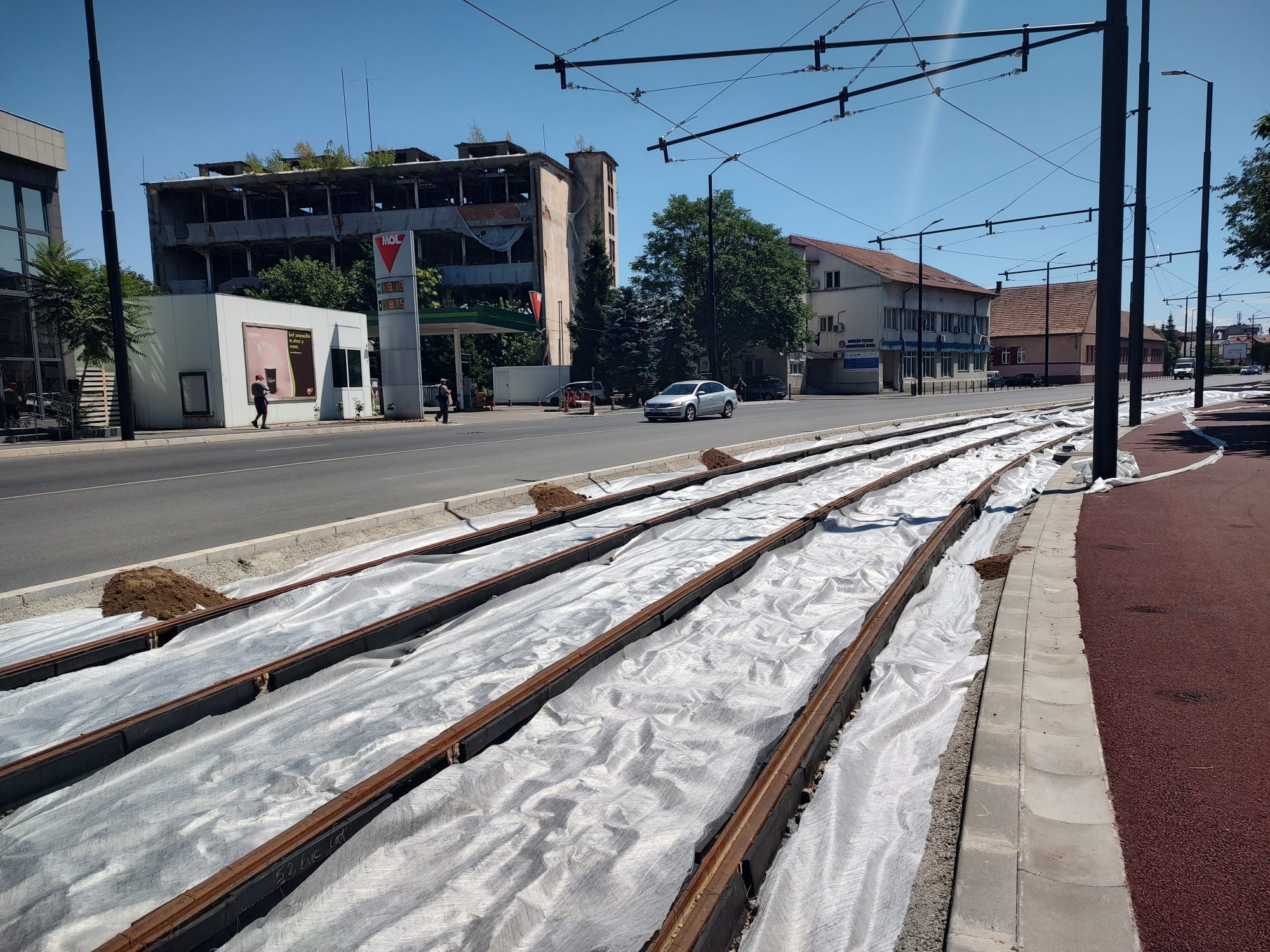 „Pe spațiul dintre liniile de tramvai a fost montat un material geotextil, cu rolul de a asigura umiditatea viitorului covor verde. În acest moment se lucrează la nivelarea pământului, lucrările continuând până în capătul coridorului Nufărul-Cantemir (bucla de întoarcere a tramvaiului). Menționăm că tubulatura pentru aspersoarele automate a fost deja montată pe partea acoperită cu pământ. După nivelarea acestuia va urma înierbarea spațiului dintre liniile de tramvai cu gazon tip rulou”, a transmis Primăria Oradea, printr-un comunicat de presă.