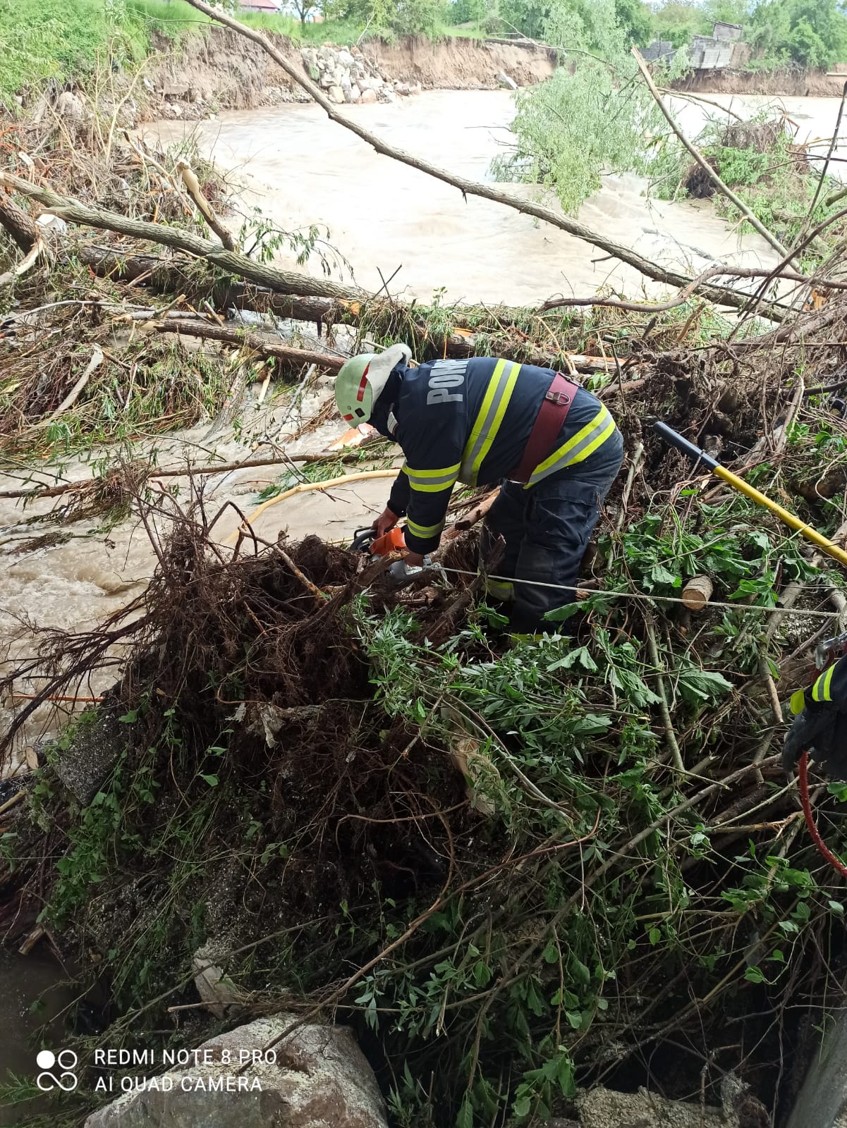 „Misiunea este una dificilă, întrucât curgerea apei în zona respectivă este blocată de trunchiuri de copaci de mari dimensiuni (inclusiv de 8-10 metri), cu rădăcini și ramuri, pompierii acționând cu drujbe, corzi, cordițe și alte echipamente specifice din dotare, pentru degajarea acestora”, precizează maior Roșca.