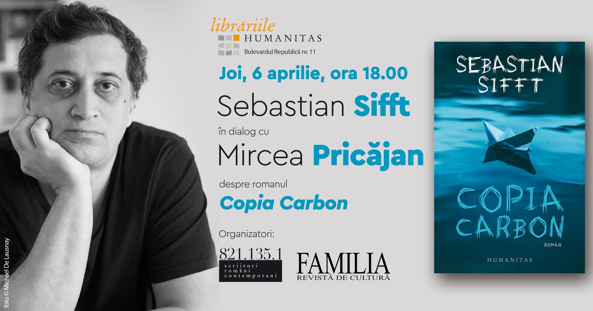 Librăria Humanitas Oradea și Editura Humanitas vă invită joi, 6 aprilie, de la ora 18:00, să luați parte la un dialog despre romanul „Copia carbon”, pe care Sebastian Sifft îl va purta cu Mircea Pricăjan. Evenimentul este organizat în parteneriat cu Revista de cultură Familia.