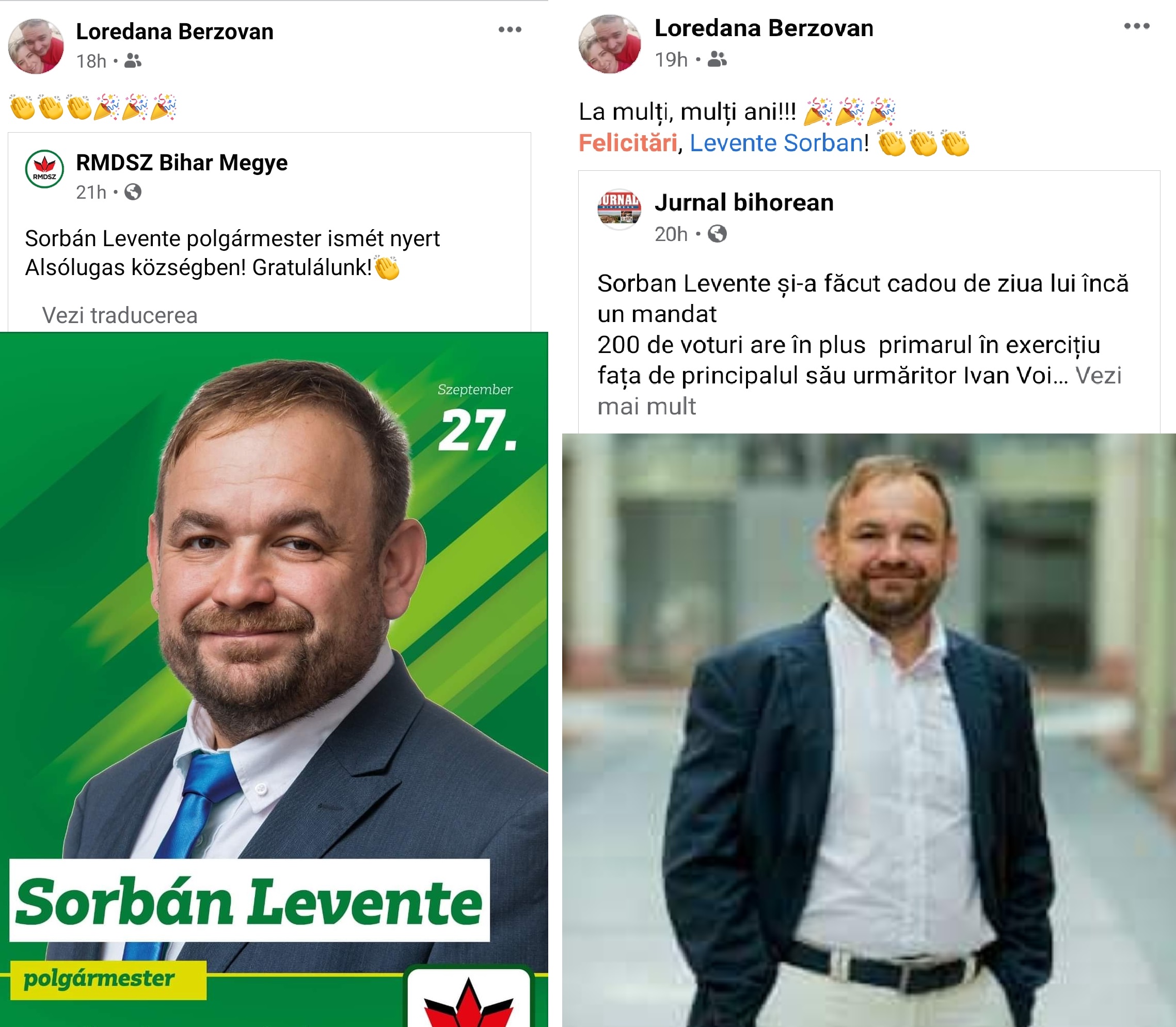 Acuzată de liberali că l-a favorizat pe primarul UDMR Sorban în mod flagrant, iată că se adeverește faptul că președinta secției de votare nr. 438 din Lugașu de Jos, Loredana Berzovan, este susținătoare a primarului care a câștigat un nou mandat. Pe Facebook, aceasta și-a arătat susținerea pentru Sorban Levente, înainte de scrutinul de duminică, iar după scrutin l-a congratulat, arătându-și satisfacția majoră pentru succesul acestuia.