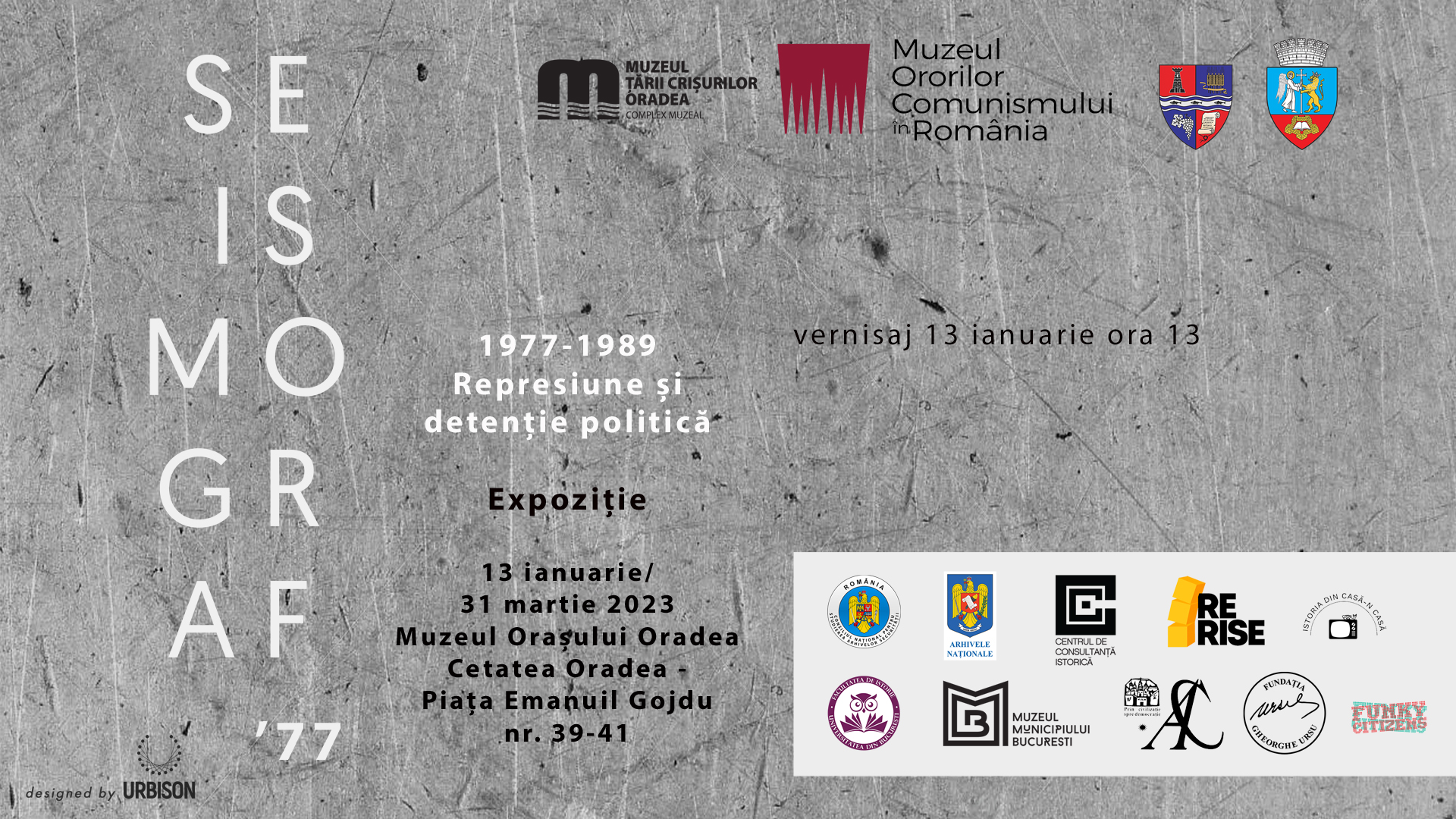 Muzeul Țării Crișurilor Oradea – Complex Muzeal împreună cu Muzeul Ororilor Comunismului în România vă invită la vernisajul expoziției „SEISMOGRAF ’77 – Represiune și detenție politică 1977 – 1989”, vineri, 13 ianuarie 2023, ora 13:00, la secția Muzeul Orașului Oradea (Cetatea Oradea), Piața Emanuil Gojdu nr. 39-41.