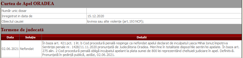 Magistrații au considerat susținerile lui Mihai Lasca drept ”simple alegații puerile, de conjunctură, nesusținute de vreun mijloc administrat în cauză, ci infirmate de probele utile reținute de instanță”. Drept urmare, pe 11 noiembrie 2020, Judecătoria Oradea l-a condamnat pe Ioan Mihai Lasca la 2 ani de închisoare cu suspendare, pedeapsă menținută miercuri de Curtea de Apel Oradea.