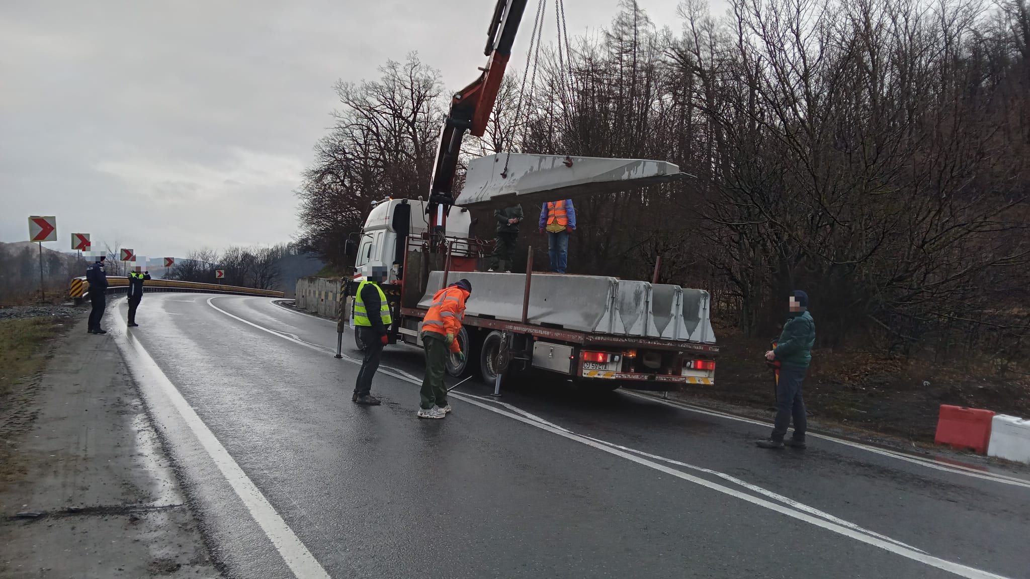 Pe axul drumului se montează parapete de beton. Traficul e ddirijat pe câte o bandă