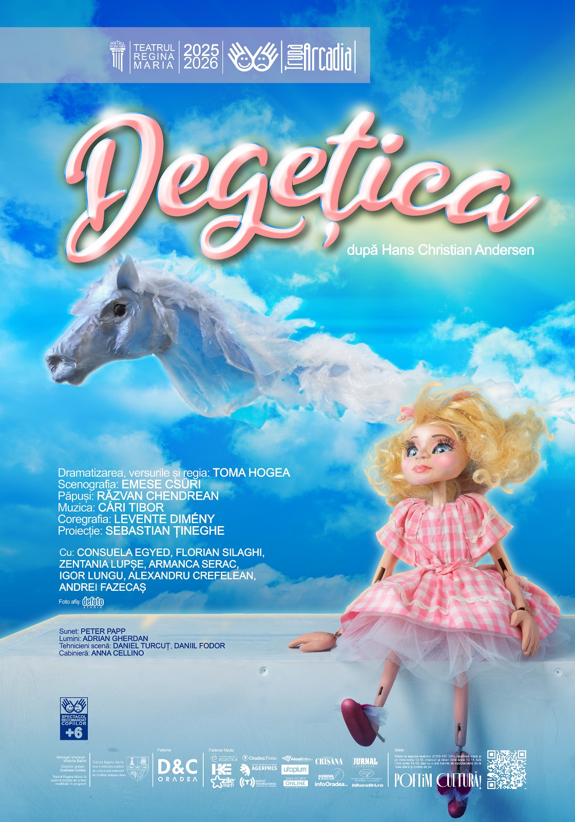 Din distribuţie fac parte actorii: Consuela Egyed, Florian Silaghi, Zentania Lupșe, Armanca Serac, Igor Lungu, Alexandru Crefelean, Andrei Fazecaș. Spectacolul este recomandat copiilor peste 6 ani. Prima reprezentaţie este sâmbătă, 27 septembrie, de la ora 11:00, următoarea are loc în aceeaşi zi, de la ora 13:00. Ambele sunt sold out. Urmează să fie programate noi reprezentații ale spectacolului „Degețica”.