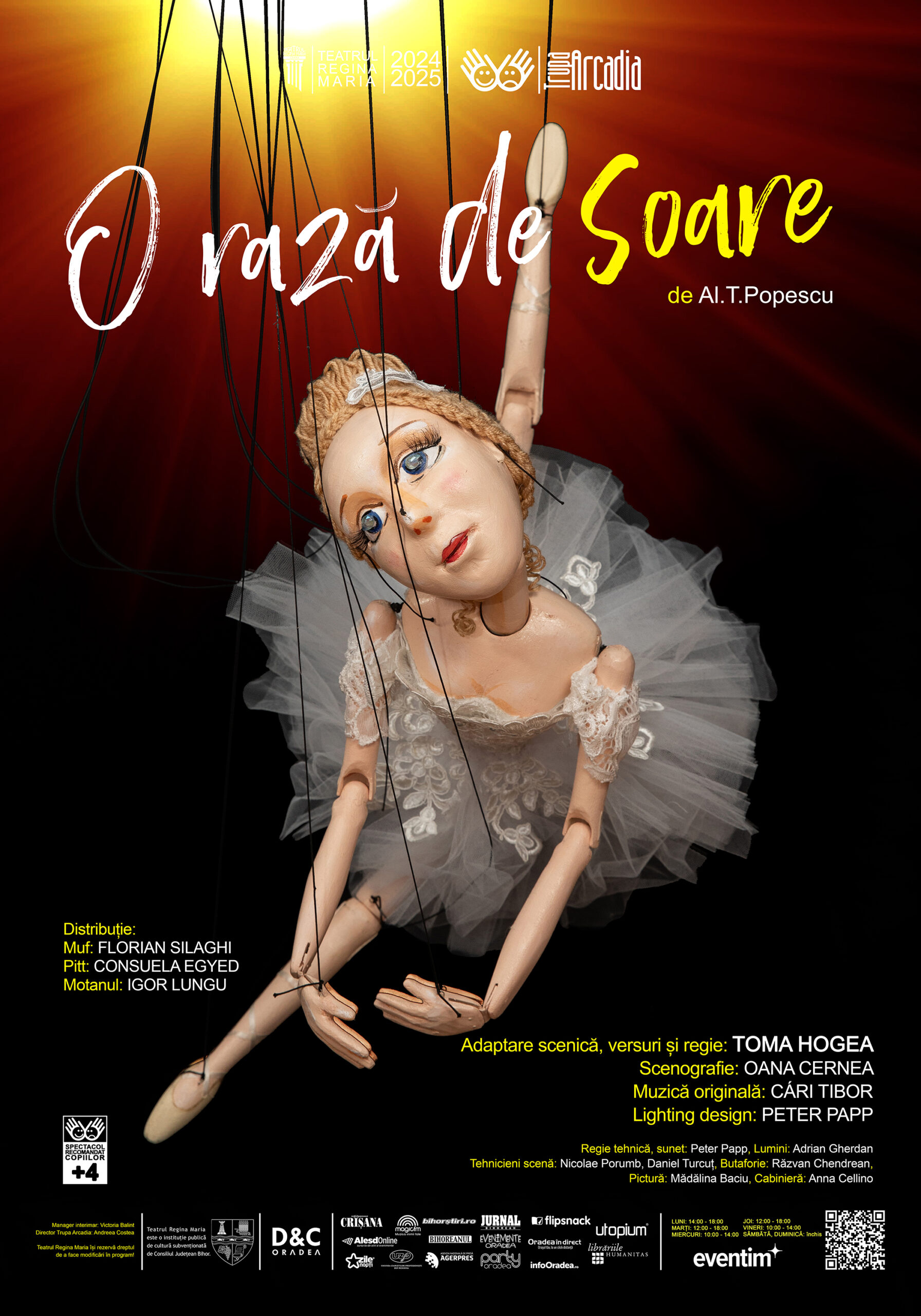 Trupa Arcadia a Teatrului Regina Maria anunță o stagiune în care vor pune în scenă spectacole unii dintre cei mai apreciați regizori de teatru de animație din țară ai momentului. Prima premieră este spectacolul „O rază de soare” de Al.T. Popescu, în regia lui Toma Hogea, care aduce pe scenă o poveste sensibilă, jucăușă.