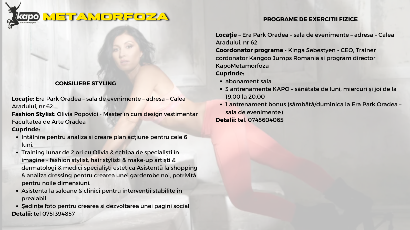 Vrei să slăbești cu zâmbetul pe buze și să îți transformi complet viața? A 4-a ediție a programului revoluționar KAPO METAMORFOZA este aici pentru tine! Cu ajutorul trainer coordonatorului Kinga Sebestyen, CEO Kangoo Jumps România și alături de echipa KAPO (Kinga Sebestyen, dr. Alin Iova, dr. Pusa Dorina Maria Farcas, dr. Olivia Burta), deținătoarea unui Guinness World Record pentru cea mai mare oră de Kangoo Jumps din istorie cu 2000 participanti, ești pe cale să te alături unei echipe care știe cum să îți aducă succesul.