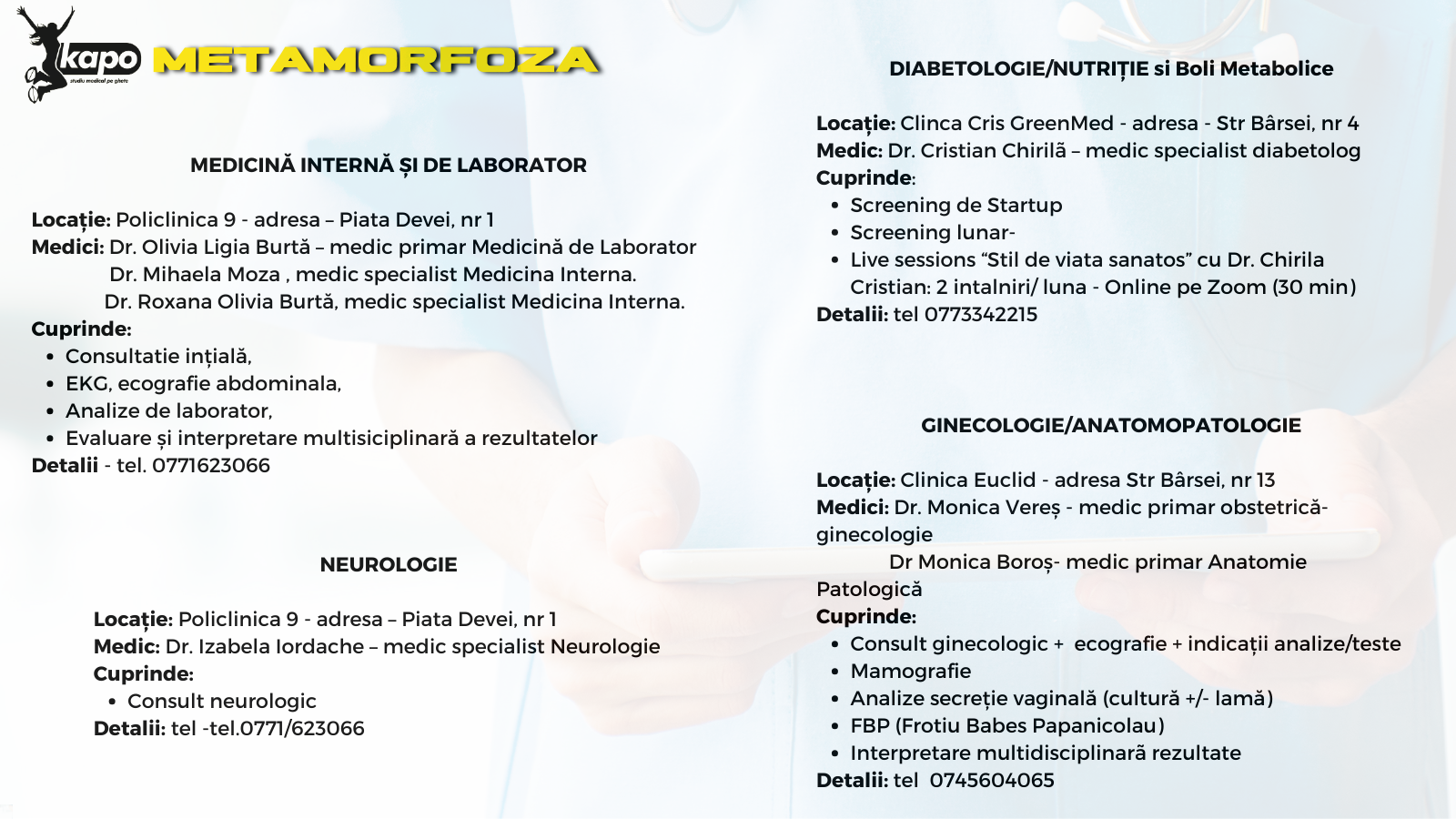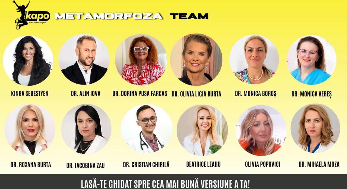 În ultima editie “KAPO – SĂNĂTATE PE GHETE – STUDIU MEDICAL”, peste 150 kg au fost eliminate, iar viețile a 80 de persoane au fost transformate. Acum, este momentul tău! Programul KAPO METAMORFOZA nu înseamnă doar exerciții și diete, ci o abordare holistică a sănătății tale alături de o echipă de specialiști care te vor ghida pas cu pas spre o schimbare totală. Vei avea parte de evaluări medicale GRATUITE.