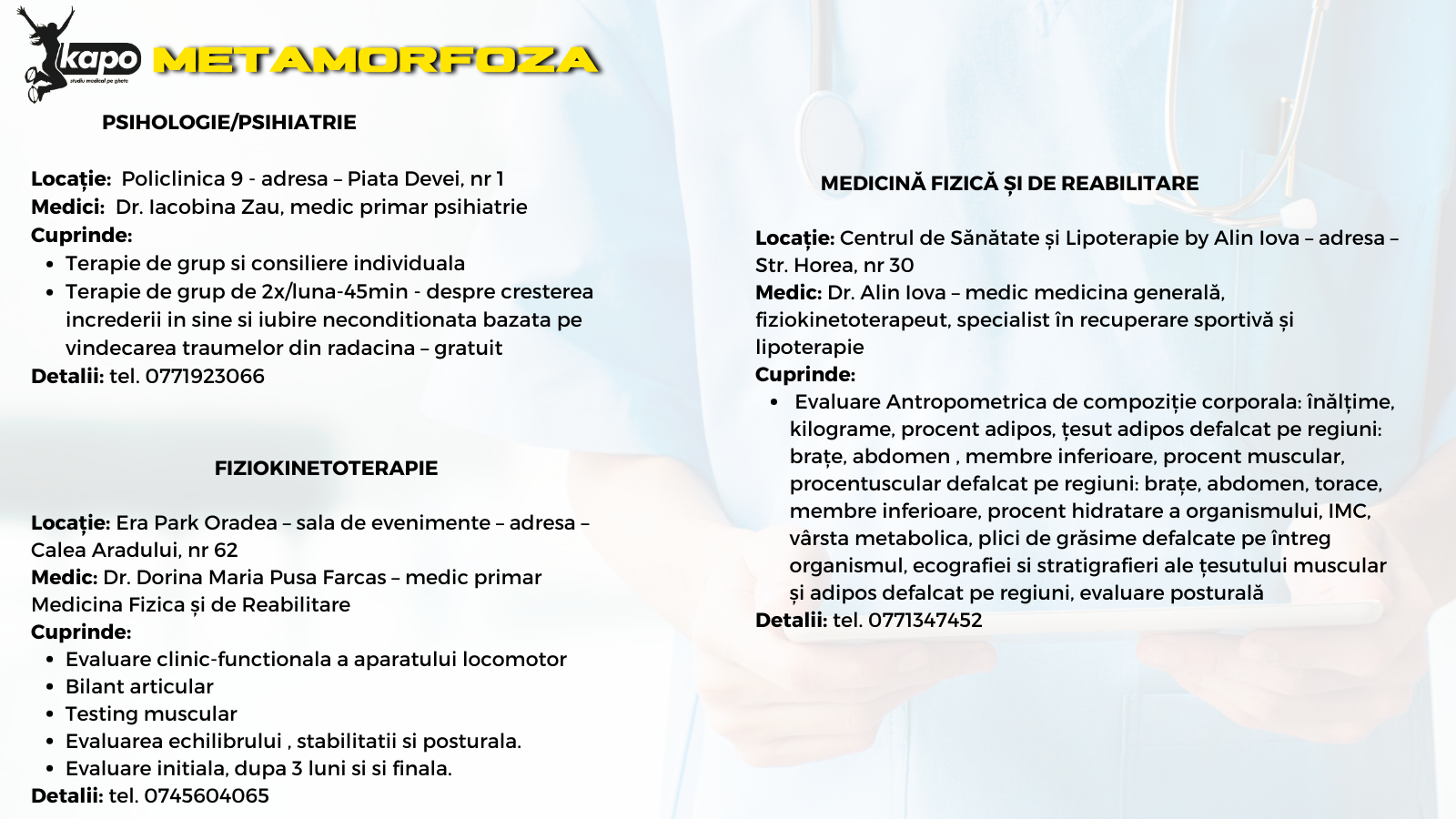 În ultima editie “KAPO – SĂNĂTATE PE GHETE – STUDIU MEDICAL”, peste 150 kg au fost eliminate, iar viețile a 80 de persoane au fost transformate. Acum, este momentul tău! Programul KAPO METAMORFOZA nu înseamnă doar exerciții și diete, ci o abordare holistică a sănătății tale alături de o echipă de specialiști care te vor ghida pas cu pas spre o schimbare totală. Vei avea parte de evaluări medicale GRATUITE.
