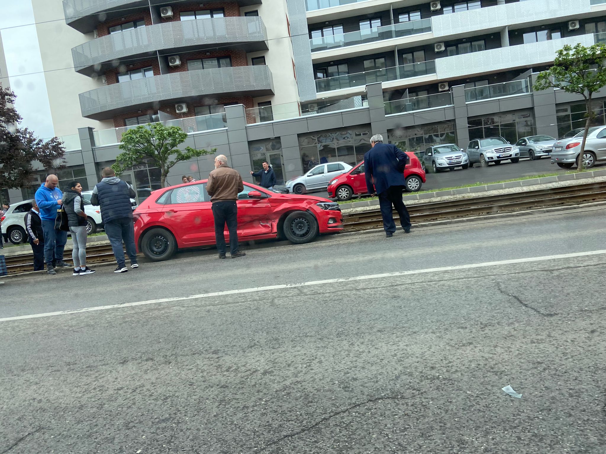 În tamponare au fost implicate două autoturisme, unul dintre ele ajungând pe șinele de tramvai.