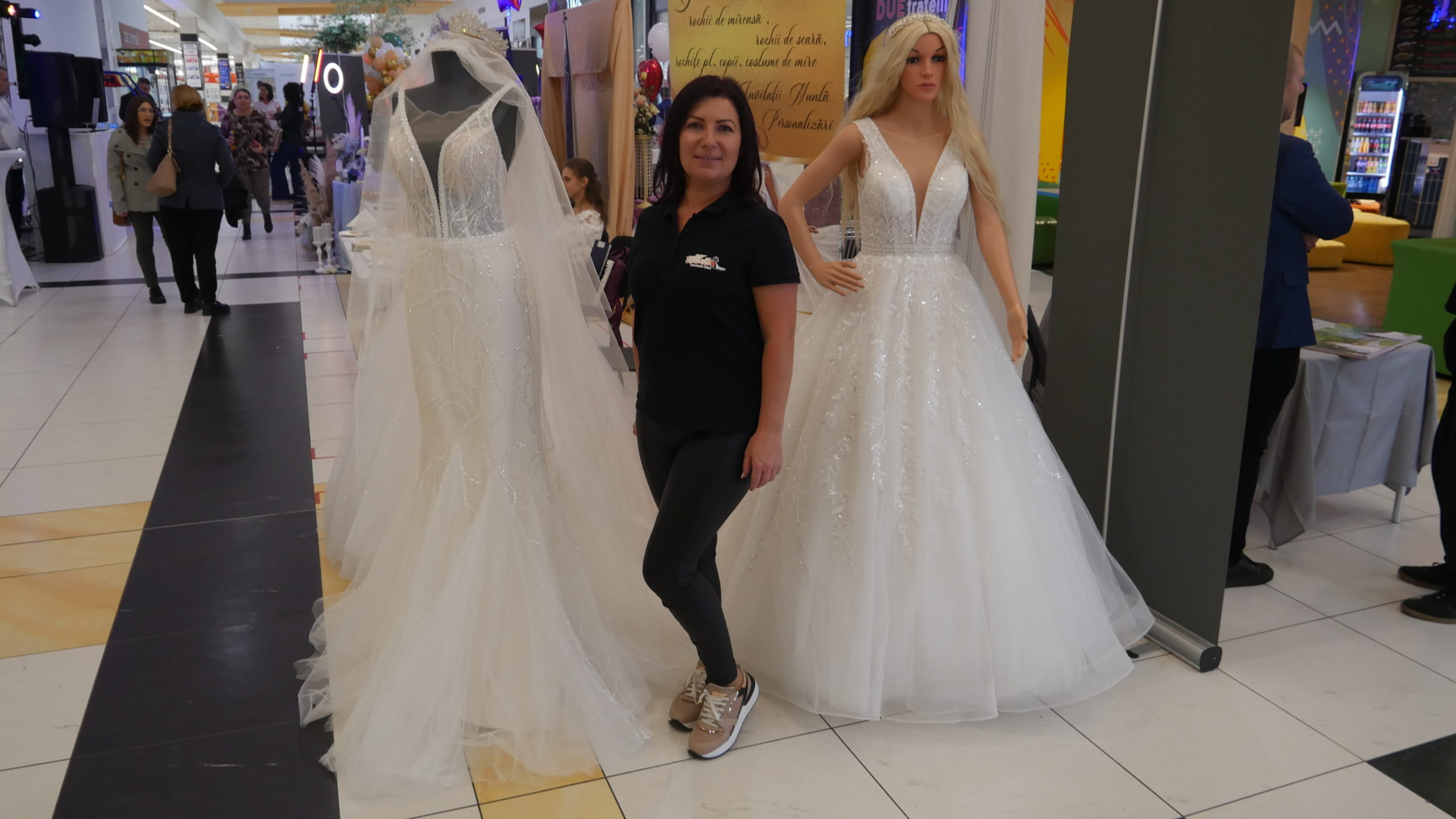 Nici mirii nu au fost uitați. Aceștia pot să își aleagă costumul care li se potrivește cel mai bine din cadrul expoziției. „Avem costume de ceremonie, care cuprind patru piese, smoking simplu sau cu sclipici, cu papion sau cravată. Cele mai solicitate sunt cele cu smoking”, ne-a explicat Kteles Andreea de la Iconi.