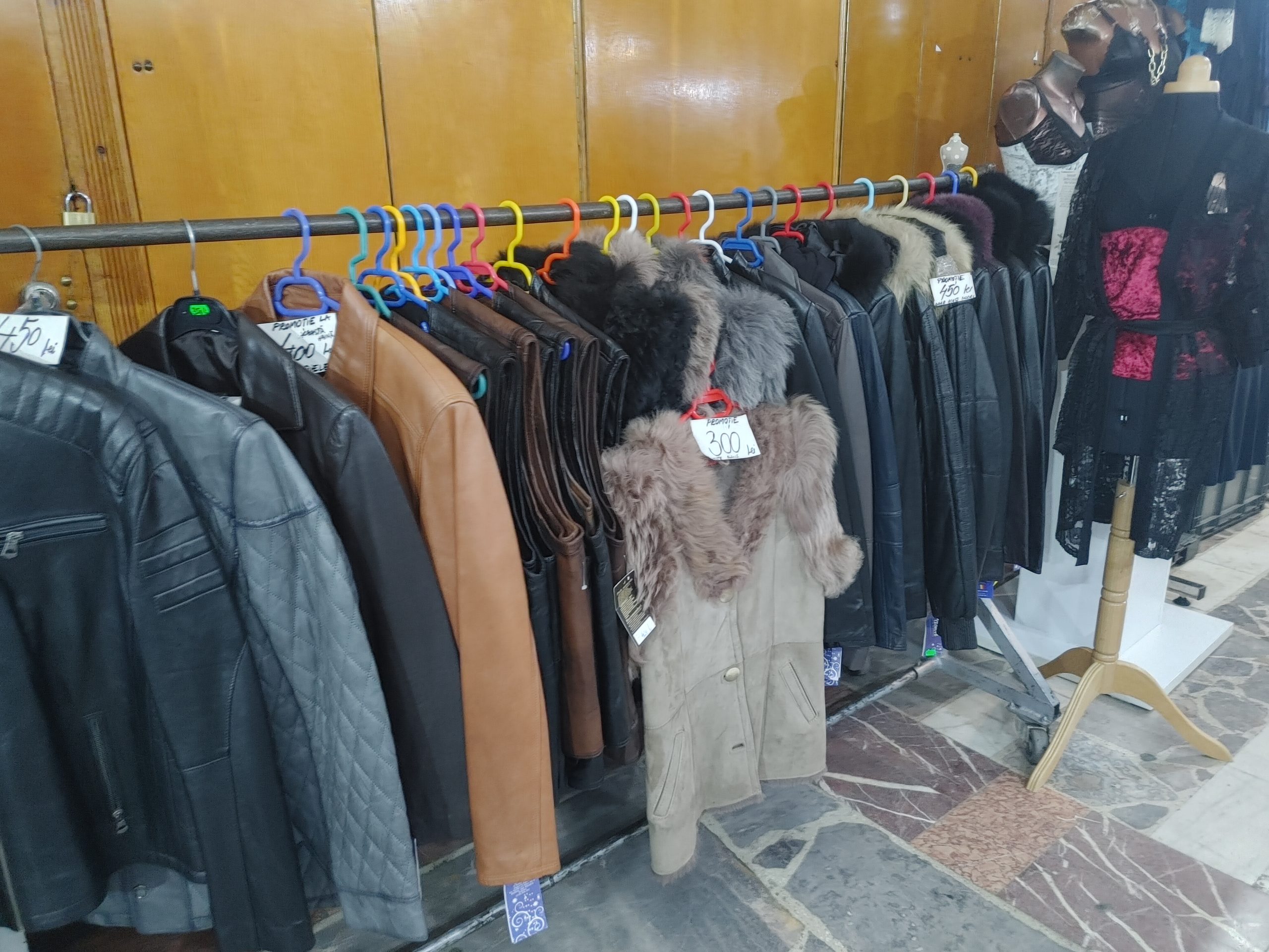 Nu lipsește îmbrăcămintea pentru sezonul rece: geci scurte și lungi din piele și blană pentru bărbați și femei, dar și paltoane, blănuri și geci din fâș sau din material.