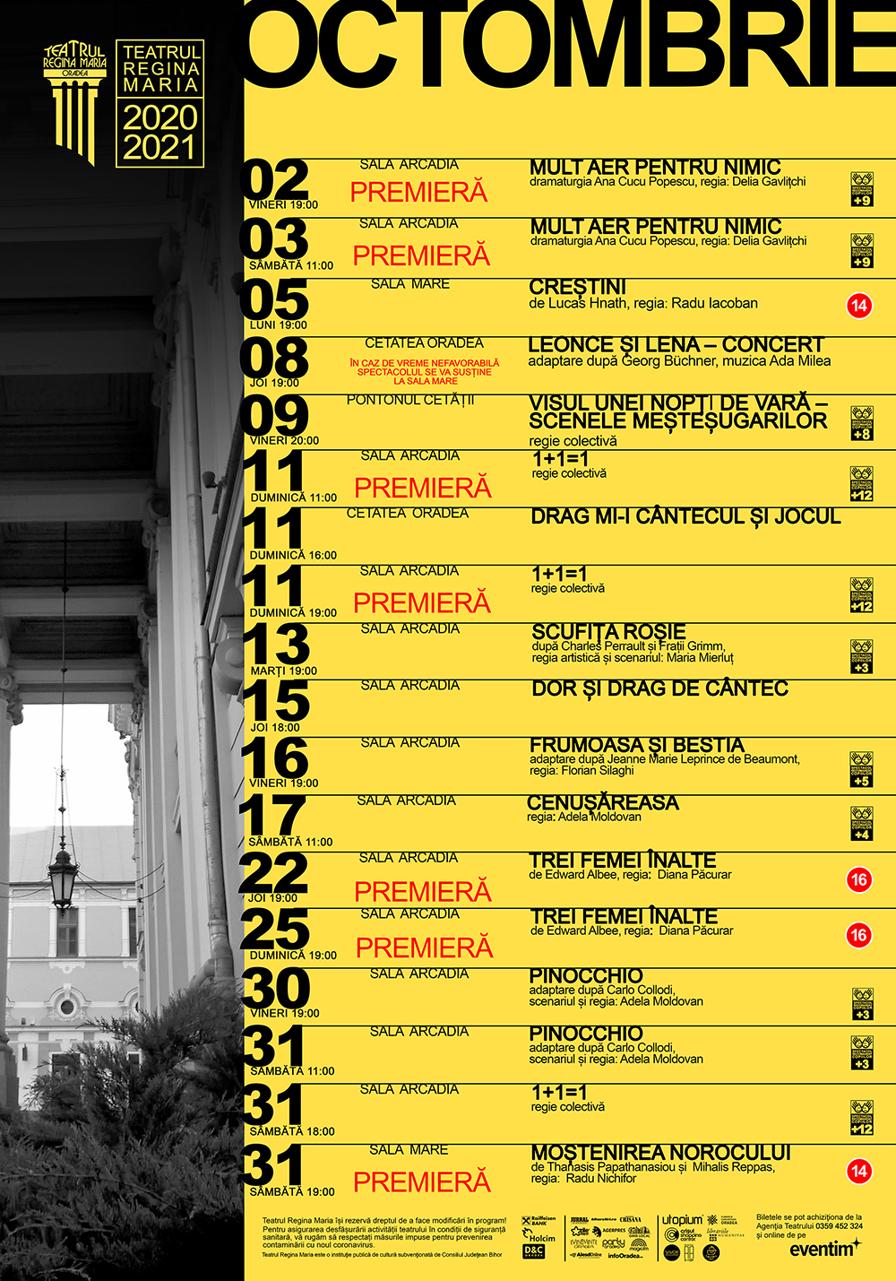 Spectatorii orădeni se vor putea bucura începând cu această lună de spectacolele Teatrului Regina Maria în Sala Mare a teatrului. Pentru asigurarea desfășurării activităților în condiții de siguranță sanitară, spectatorii sunt invitaţi să respecte câteva reguli importante printre care purtarea măștii pe toată durata evenimentului, de la intrarea în foaier, până la părăsirea clădirii.