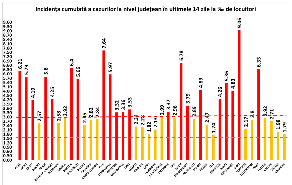 Coeficientul infectărilor cumulate la 14 zile, raportate la 1.000 de locuitori este calculat de către Direcțiile de Sănătate Publică, la nivelul Municipiului București și al județelor. Mai jos aveți graficul realizat în baza raportărilor primite de CNCCI de la Direcțiile de Sănătate Publică: