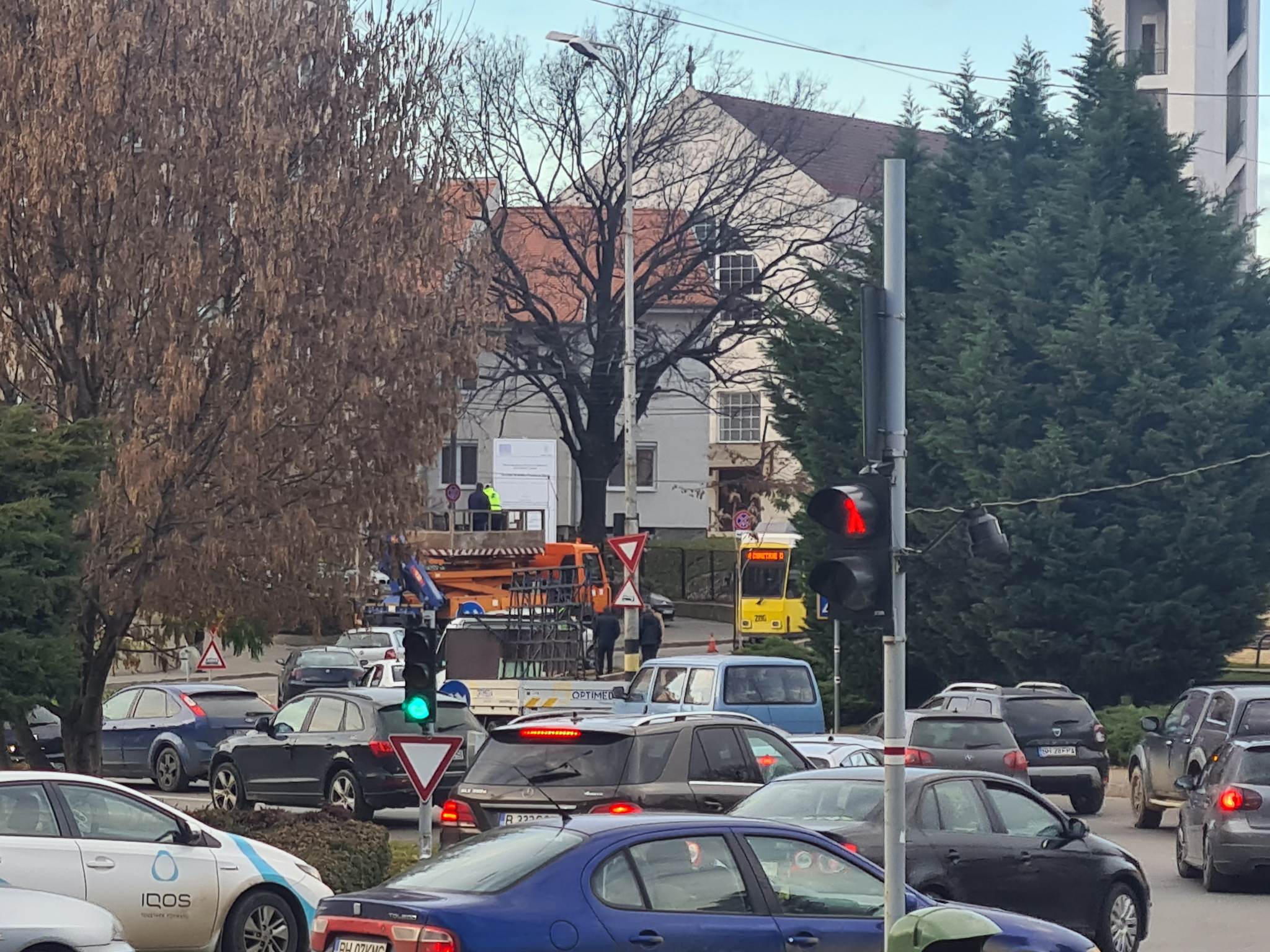 Un camion care urca un drum adiacent a agățat și a rupt firul de curent al tramvaielor.