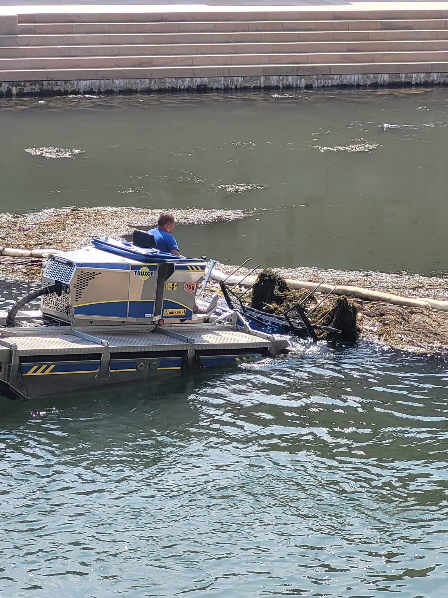 De trei săptămâni, pe tronsonul Pod Prezan-Pod Ladislau, Administrația Bazinală de Apă Crișuri intervine cu un utilaj modern de curățare și degajare a vegetației acvatice dezvoltate excesiv în albia râului Crișul Repede.