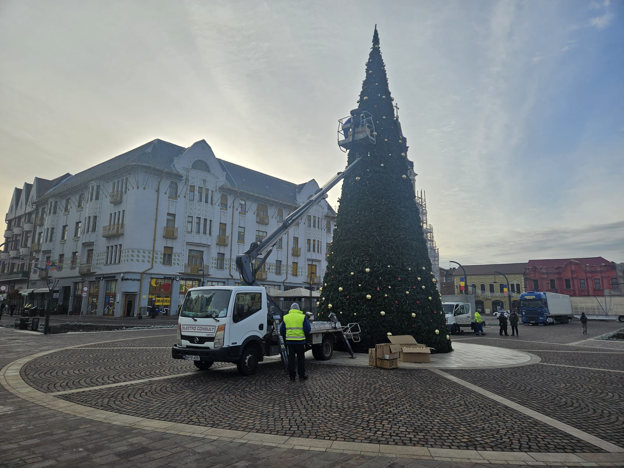 În dimineața zilei de luni, 25 noiembrie, muncitorii aranjau ultimele globuri pe bradul de Crăciun înalt de 19 metri, amplasat în Piața Unirii. Tot aici, aceștia au început și montarea Casei ZU, unde, așa cum Bihon.ro a mai scris, echipa Radio ZU se va întoarce.