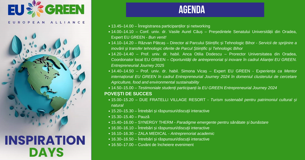 „Inspiration Days” face parte din cea de a doua ediție a „Entrepreneurial Journey”, un proiect al alianței europene EU GREEN. Sub deviza „Oportunități de antreprenoriat și inovare”, evenimentul se va axa, de această dată, pe două dintre cele mai importante clustere de cercetare ale EU GREEN: „Paradigme emergente pentru sănătate și bunăstare”, respectiv, „Turism sustenabil pentru patrimoniul cultural și natural”.