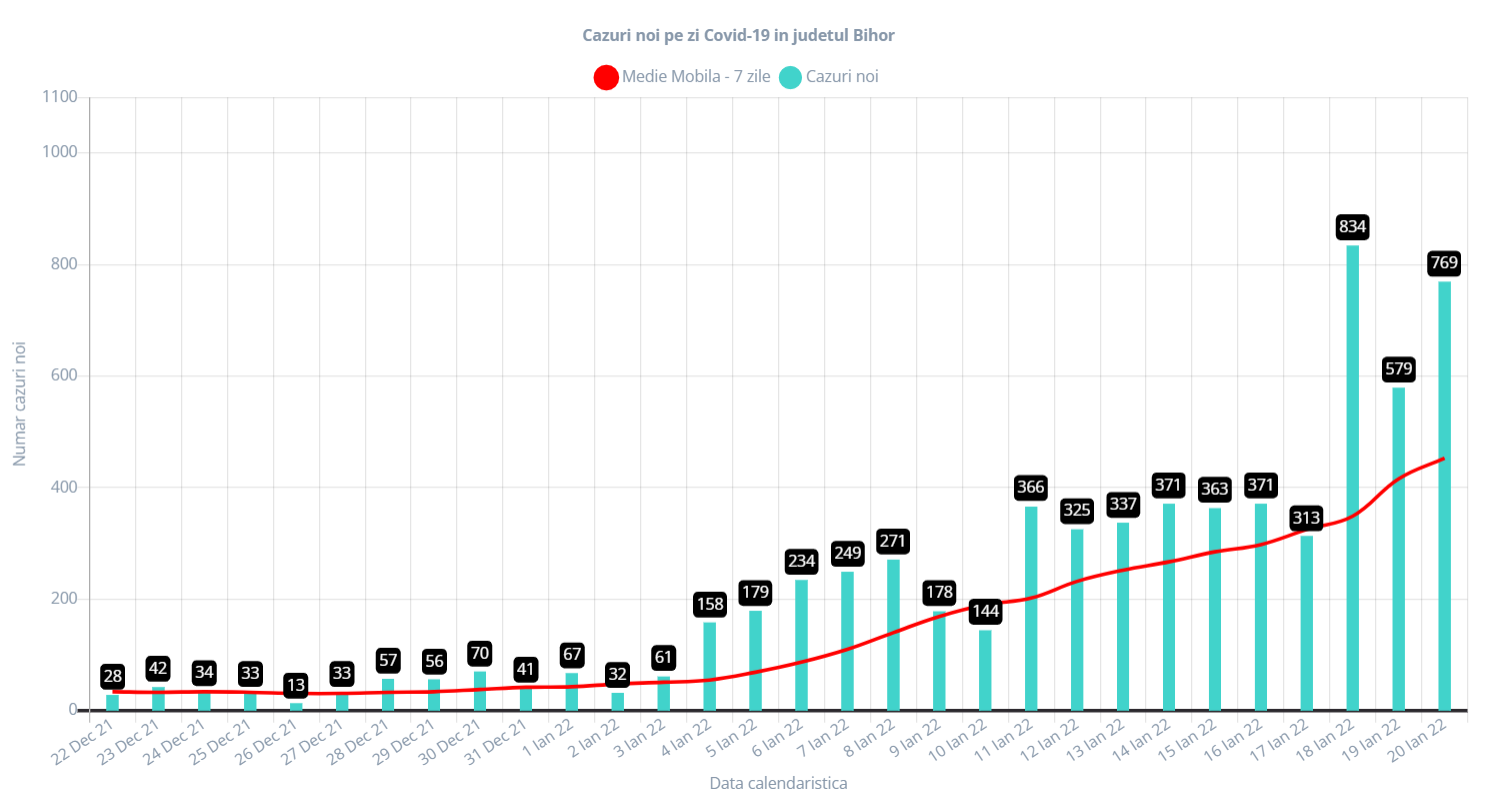 Potrivit bilanțului prezentat vineri, 21 ianuarie, de către Direcția de Sănătate Publică Bihor, în ultimele 24 de ore au fost confirmate 764 de noi infectări, în baza prelucrării a 2.269 de teste COVID. Astfel, rata de pozitivare a testelor efectuate în ultimele 24 de ore a fost de 33.6%, ceea ce înseamnă ce unul din trei teste efectuate a fost declarat pozitiv.