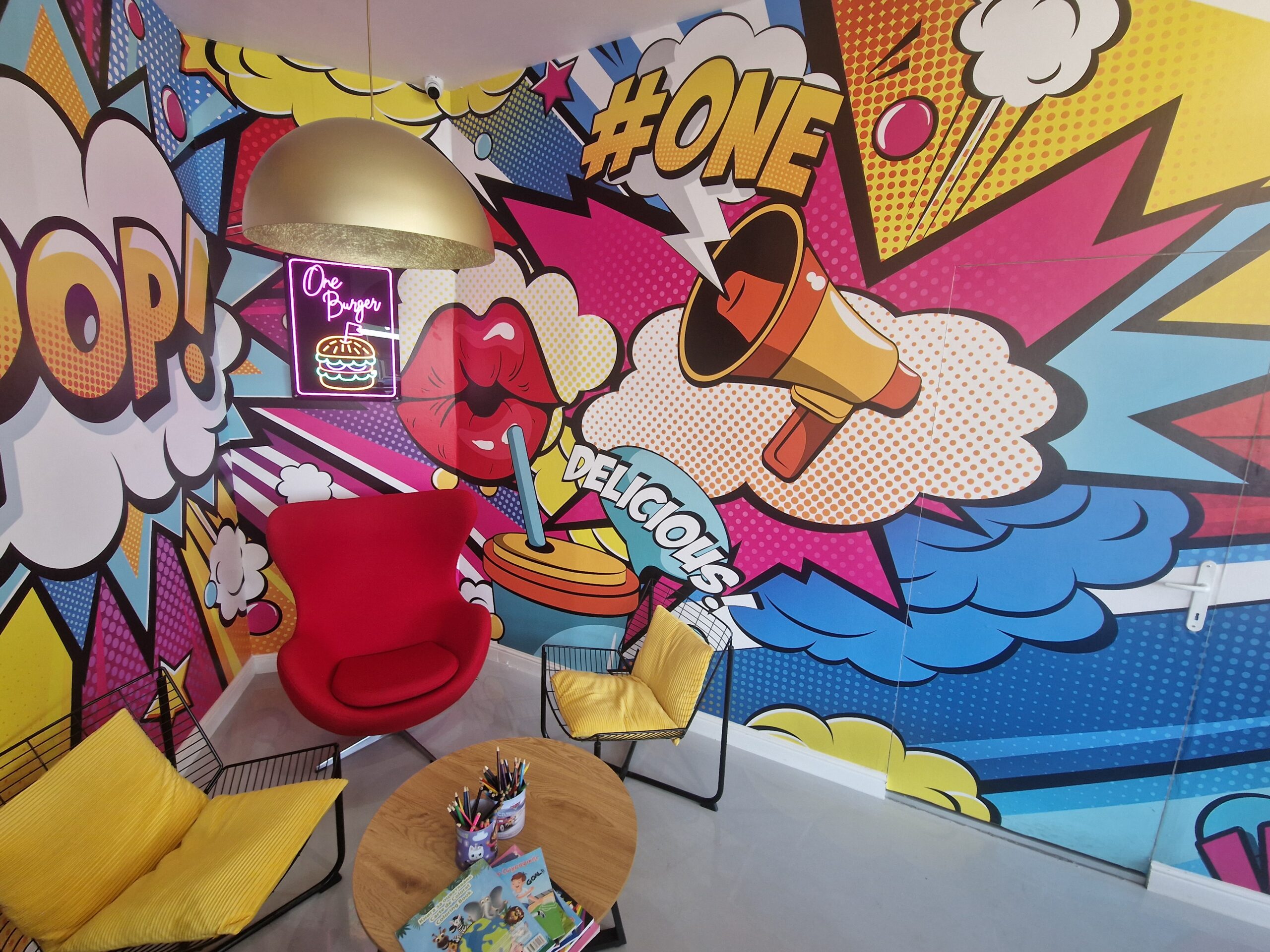Locația a devenit foarte primitoare, datorită desenelor drăguțe de pe pereți și a designului modern și colorat! Dar și a reclamei de afară, care fără să vrei te atrage!