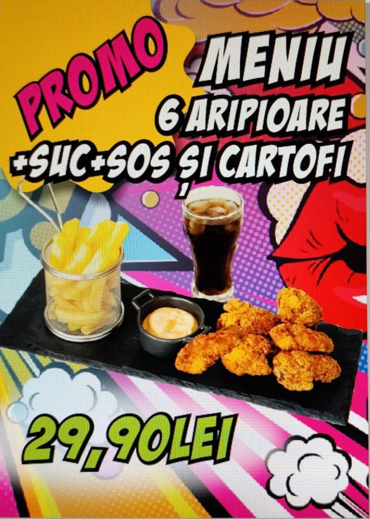 În această perioadă, meniul de aripioare este disponibil la un preț promoțional de doar 29,90 lei. Oferta include 6 aripioare crocante, cartofi aurii, sos și o băutură răcoritoare. Oferta ţine toată luna octombrie!