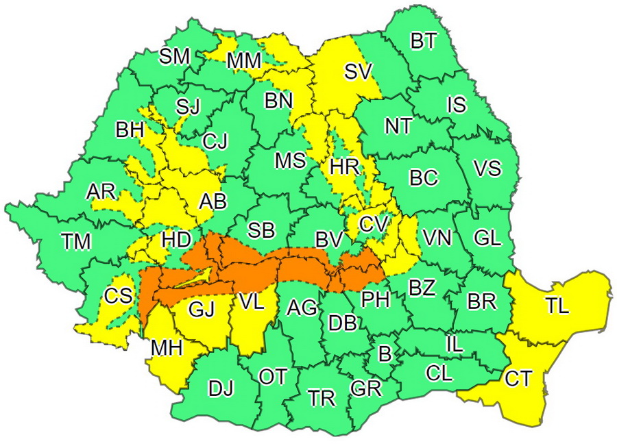Sunt condiții și pentru depunerea unui strat de zăpadă între 10 și 15 cm, la deal și la munte, meteorologii transmit că zona înaltă a județului se va afla de joi, ora 14, până sâmbătă, la ora 2:00 dimineața, sub incidența unui cod galben de precipitații și intensificări ale vântului.
