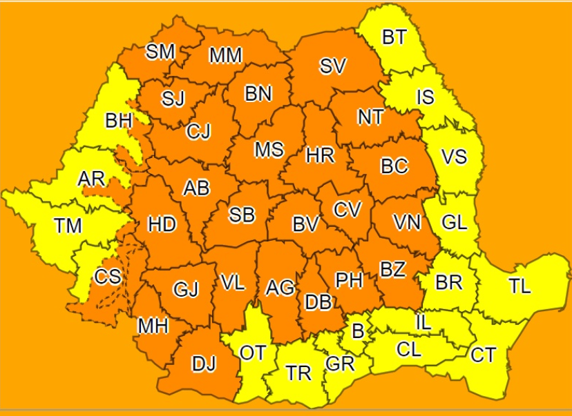 Cea de-a doua avertizare meteo, de cod portocaliu, va intra în vigoare începând de sâmbătă de la ora 09:00 și este valabilă până duminică, la ora 03:0.