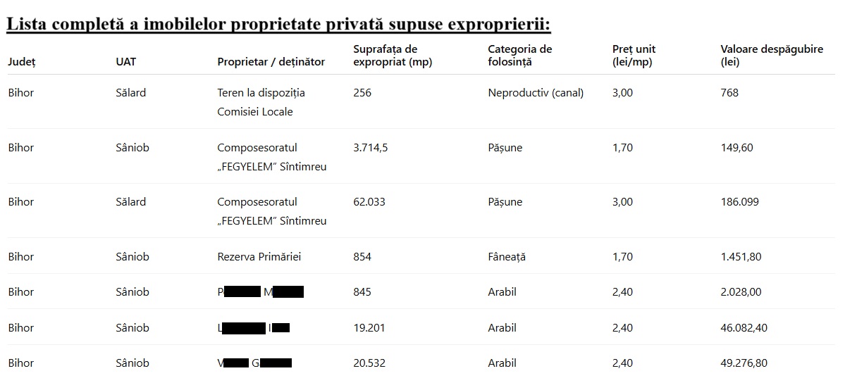 Lista oficială a exproprierilor cuprinde terenuri agricole, pășuni și fâneață, proprietate atât privată, cât și a unităților administrativ-teritoriale. Printre cei afectați se numără persoane fizice și asociații, precum Composesoratul de Pădure și Pășune „FEGYELEM” Sîntimreu. De exemplu: